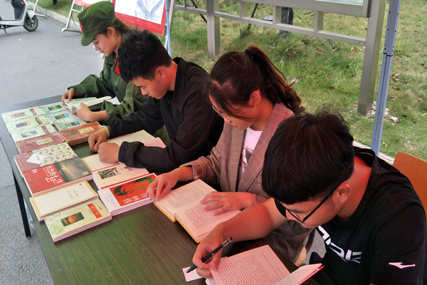 在仁苑食堂门前举行红色经典阅读宣传活动,现场向过往的同学宣传和推荐红色经典书籍,鼓励大家品读红色经典,了解革命先辈的先进事迹,传承革命精神。活动现场摆放40余本红色经典书籍供同学们阅读,近120名同学参加现场阅读,共征集到130余条红色经典语录。