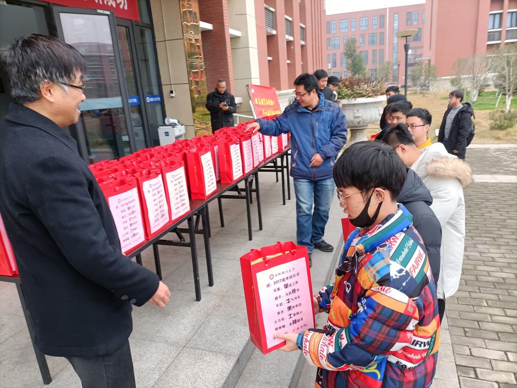 精心准备的“考研大礼包”,里面有苹果、橙子、牛奶、士力架、果冻、棒棒糖,寓意着“苹”安上岸、马到“橙”功、“牛”气冲天、“果”然有你、“士”事顺心、金“棒”题名。活动在一片温情中圆满结束。