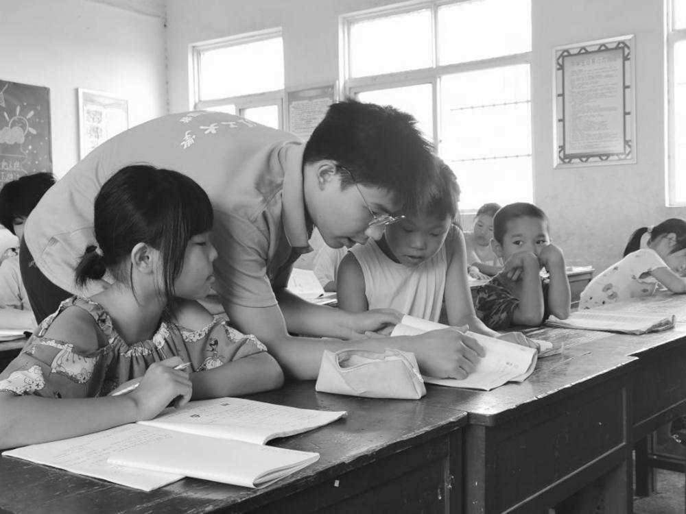 图为大学生在给农村儿童讲解知识