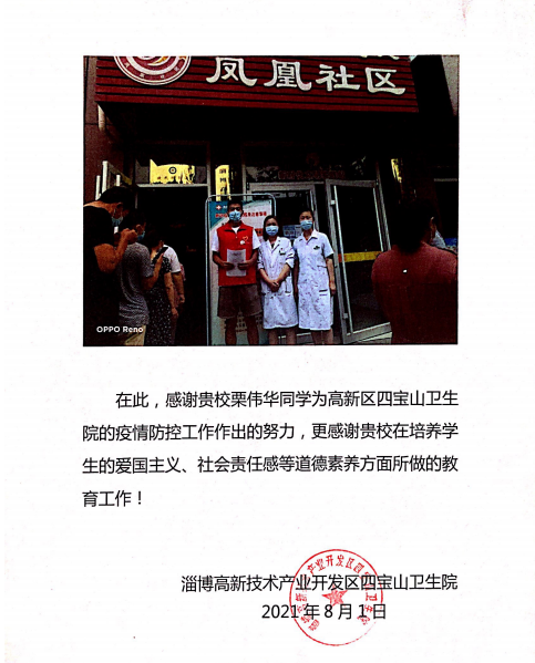 2018级1班栗伟华同学用自己的行动诠释了青年一代的勇敢与坚强、责任和担当,主动报名参加高新区四宝山卫生院防疫志愿者表示感谢。