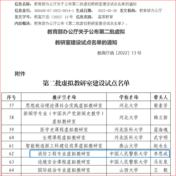 消防工程专业作为成员单位参与申报的“消防工程专业虚拟教研室”获批教育部第二批虚拟教研室建设试点。