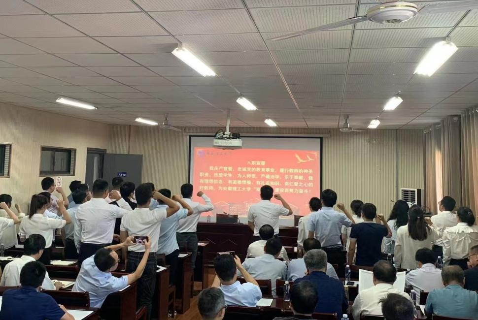 2020年新成立以来进校的青年教师在全院教师的见证下,庄严宣誓:“忠诚党的教育事业,履行教师的神圣职责,热爱学生,为人师表,严谨治学,乐于奉献,做有理想信念、有道德情操、有扎实知识、有仁爱之心的好教师,为安徽理工大学‘双一流’创建而努力奋斗!”