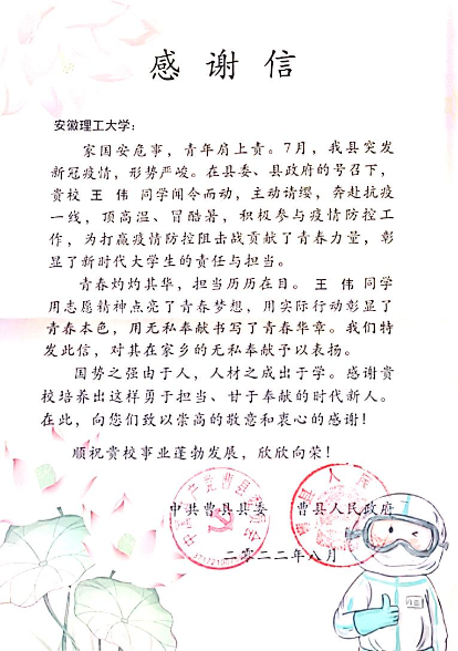 2022年7月,山东省曹县突发新冠疫情,王伟同学主动请缨,参与疫情防控工作,争当疫情防控的“秩序员”“排查员”“宣传员”,用志愿精神点亮了青春梦想,用实际行动彰显了青春本色,用无私奉献书写了青春华章。