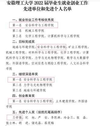 荣获2022届毕业生就业创业工作“考核优秀奖”、2022届毕业生就业创业工作“继续深造率奖”、2022届毕业生就业创业工作“创业教育奖”、2022届毕业生就业创业工作“目标完成奖”等就业考核的全部奖项。毕业班辅导员兰学强老师获得2022届毕业生就业创业工作“先进个人奖”。