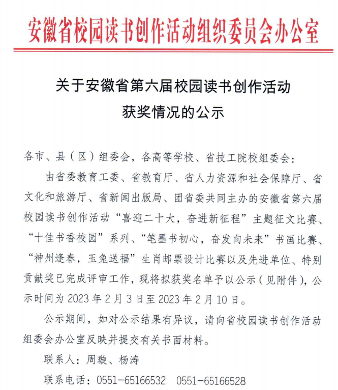近日,由安徽省委教育工委、省教育厅、省人力资源和社会保障厅、省文化和旅游厅、省新闻出版局、团省委共同主办的安徽省第六届校园读书创作活动评审结果揭晓,足球分析网站