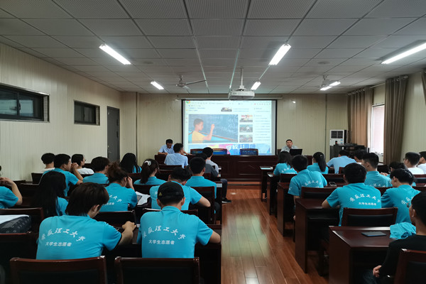 暑期社会实践的团队立项情况,强调了活动开展要求及结项条件。消防19-2班张耀元同学作为志愿者代表做出征交流发言,安全19-4班徐金林同学带领现场全体志愿者进行宣誓。