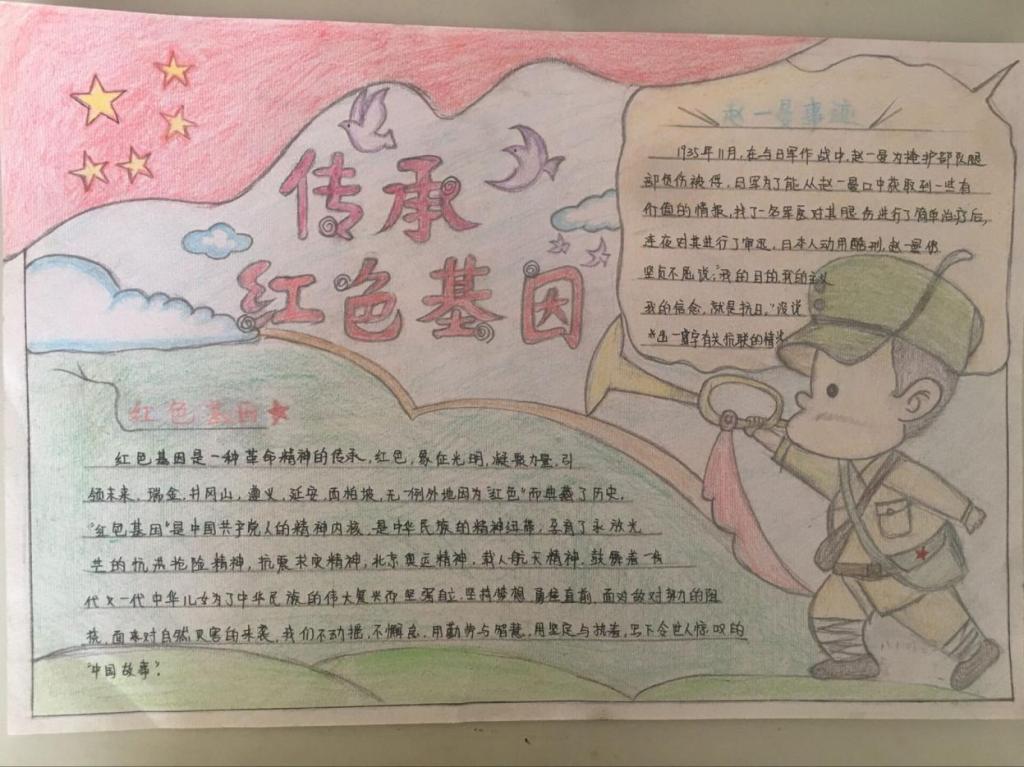 举办了“红色经典手抄报制作”活动。同学们把自己对红色经典的理解全部融入在了手抄报里面,作品内容丰富多彩,构思新颖,谱写了一篇篇美丽的赞歌。字里行间体现出了同学们对待此次活动的认真态度。最终评审出,江宏恩获得一等奖,赵雪威、薛蕴泽获得二等奖,李文瑞、朱建学、付贝获得三等奖。