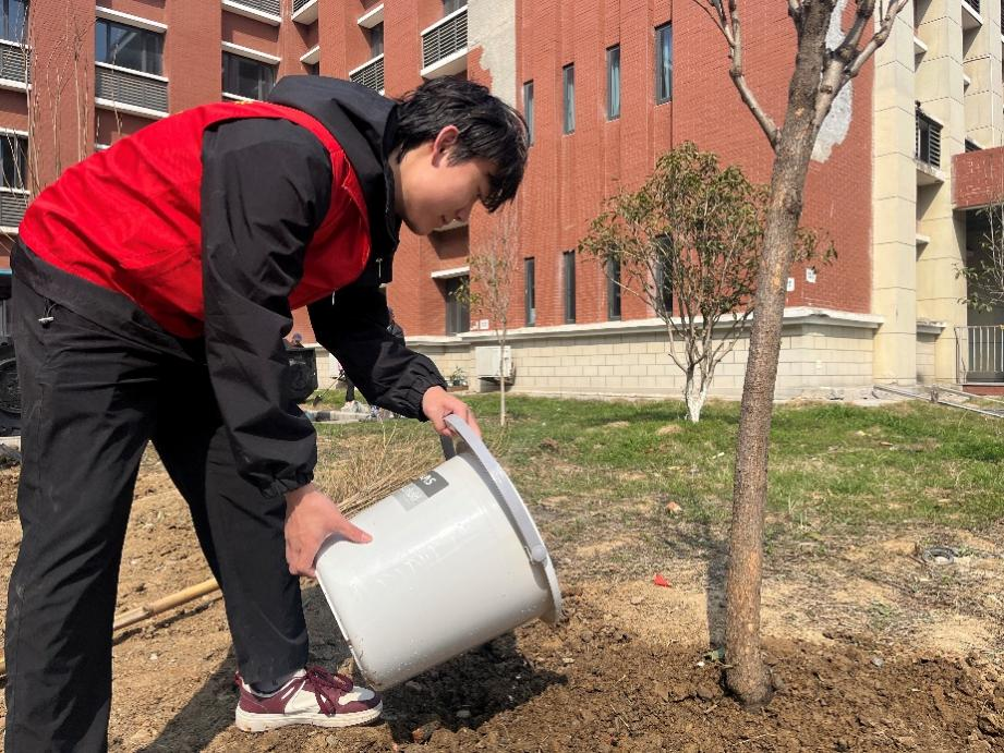 雷锋志愿者们在宁远楼周边组织开展了植树活动。扛苗散苗、挥锹铲土、填树入坑、扶苗踏实,随后堆围堰、培新土、提桶浇水。活动现场人头攒动,呈现出一派热火朝天的劳动景象,志愿者们充分发扬团结、互助、友爱、进步的精神,展现当代团员青年良好的精神风貌。