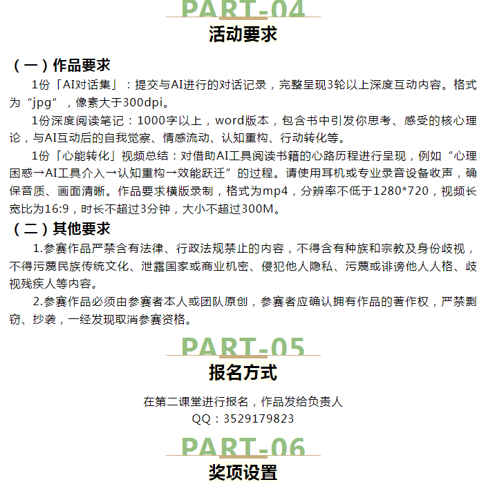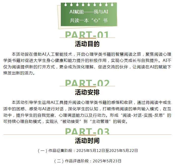 公号发布了《AI赋能——我与AI共读一本“心”书》活动,此活动通过借助AI人工智能技术,开启心理学类书籍的智慧阅读之旅,聚焦阅读心理学类书籍对促进大学生身心健康和能力提升的积极作用,实现心灵成长与自我提升。
