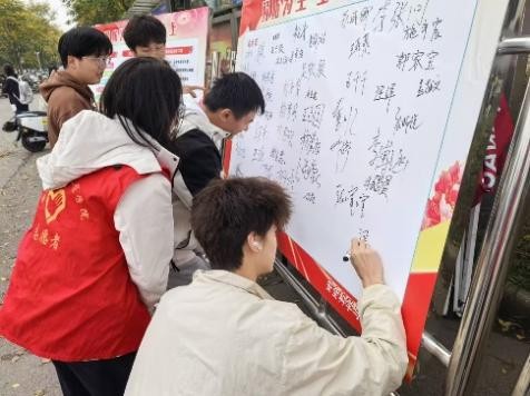 11月9日消防日当天,志愿者们在校园内设立宣传点,通过悬挂横幅,展板展示、发放宣传资料等形式,向过往师生普及消防安全常识,并组织师生在宣传横幅上签名承诺,进一步增强“消防安全、人人有责”的共识。