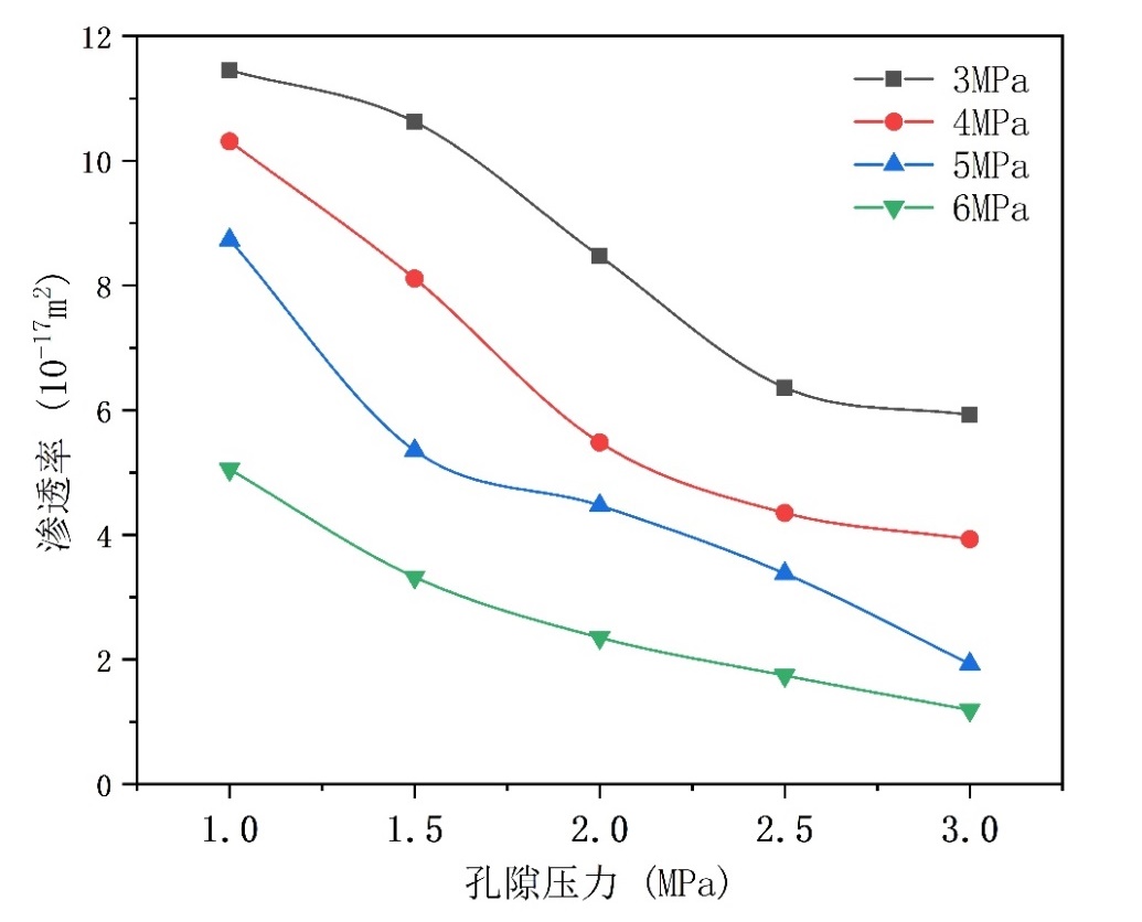 图2 不同围压下煤体渗透率随孔隙压力变化图