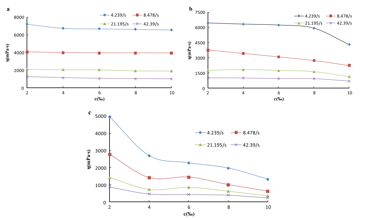 图1 添加盐的浓度对凝胶泡沫粘度(η)的影响。(a)氯化钠 ; (b)氯化钙 ; (c)氯化铝 .