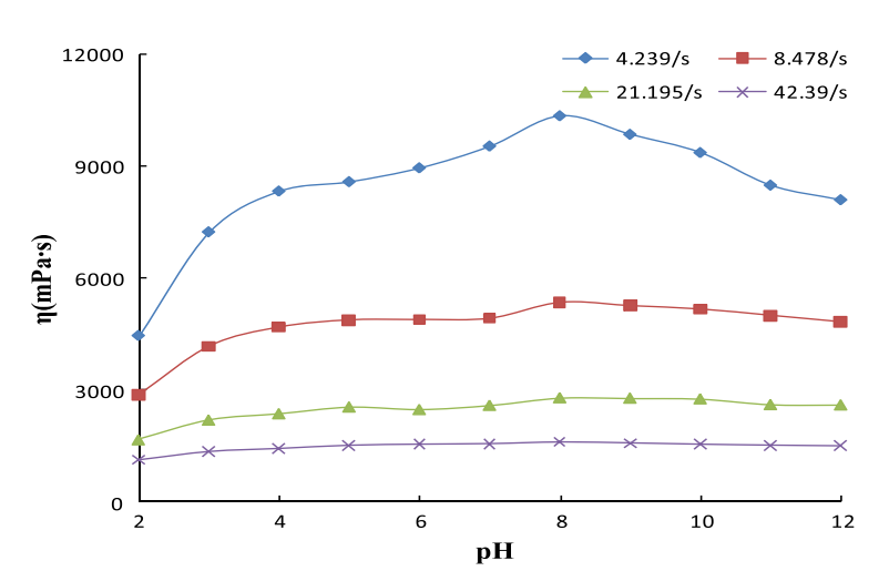 图2 不同pH值下的粘度(η)与剪切速率(γ)的关系图。