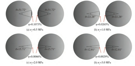(1)建立了突出煤颗粒碰撞二次破碎理论模型,突出煤颗粒的运动速度和抗压强度对碰撞后接触面的开口角度极限值的影响是非常显著的。相同运动速度条件下,随着抗压强度的增加,单次碰撞接触面的开口角度极限值表现出下降的趋势,且抗压强度低于2 MPa时开口角度极限值的下降速度较快。相同抗压强度条件下,随着运动速度的增加,单次碰撞接触面的开口角度极限值呈增加趋势。