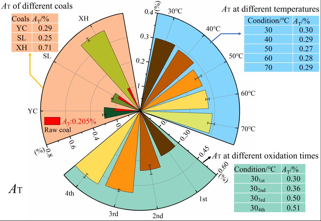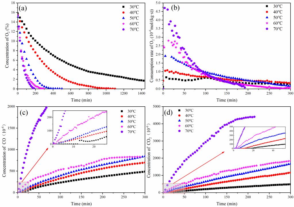 采用氧同位素示踪法测定引发煤自燃活性物质的结构和贡献。在人为改变氧同位素比值后,煤样在18O2气氛下,进行了不同温度、不同氧化次数以及不同煤样的等温氧化。首先,通过循环氧化实验得到了煤的氧化产气特性,提供了气体同位素试验的基本参数。然后使用同位素比质谱仪测试被18O标记的氧化产物,分析煤中的原始活性物质的结构及贡献。最后,使用XPS测定了煤中官能团的演化,分析了活性物质的转化途径。结果表明,在氧化过程中,70%以上的CO是由煤中原有的羟基和醛生成的,99%以上的CO2是由煤中原有的羧基生成的。抑制羟基、醛、羧基的氧化分解可以有效控制煤自燃,解决低阶煤氧化引起的CO溢出问题。